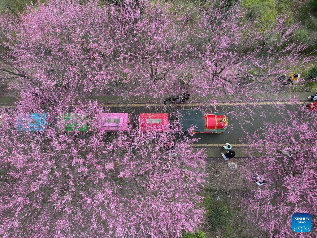 This aerial photo taken on Feb. 25, 2023 shows visitors enjoying flower scenery on a sight-seeing vehicle in Yuqing County, Zunyi, southwest China's Guizhou Province. (Photo by He Chunyu/Xinhua)