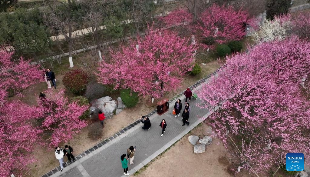 This aerial photo taken on Feb. 25, 2023 shows people enjoying flowers in Xiangyang, central China's Hubei Province. (Photo by Yang Dong/Xinhua)