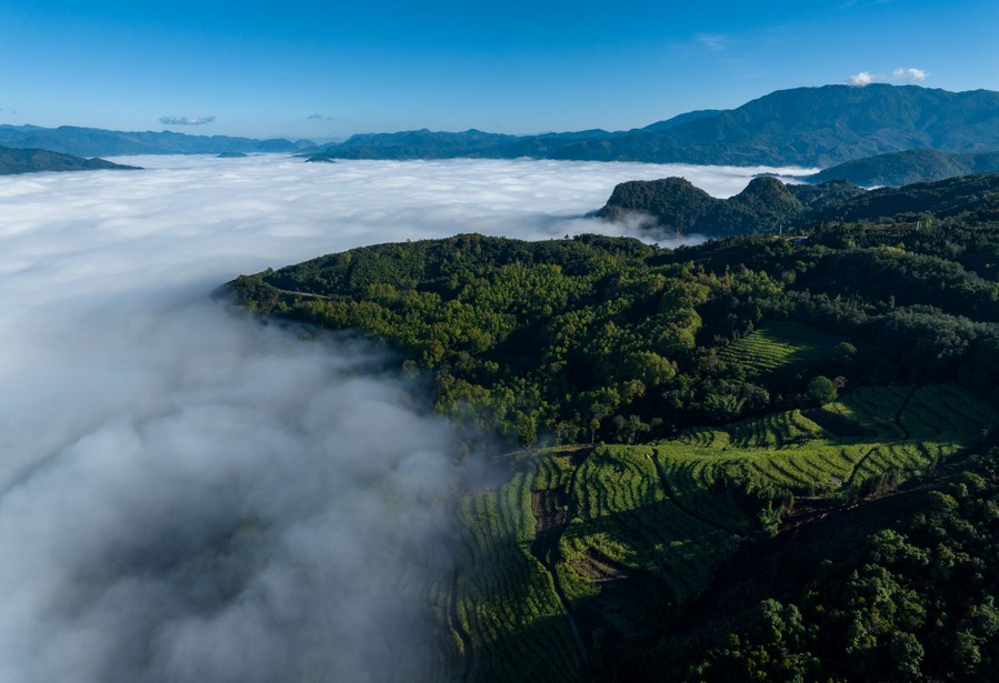 This aerial photo taken on Dec. 9, 2022 shows tea garden amid sea of clouds in Cangyuan Wa Autonomous County, Lincang City of southwest China's Yunnan Province. (Xinhua/Jiang Wenyao)