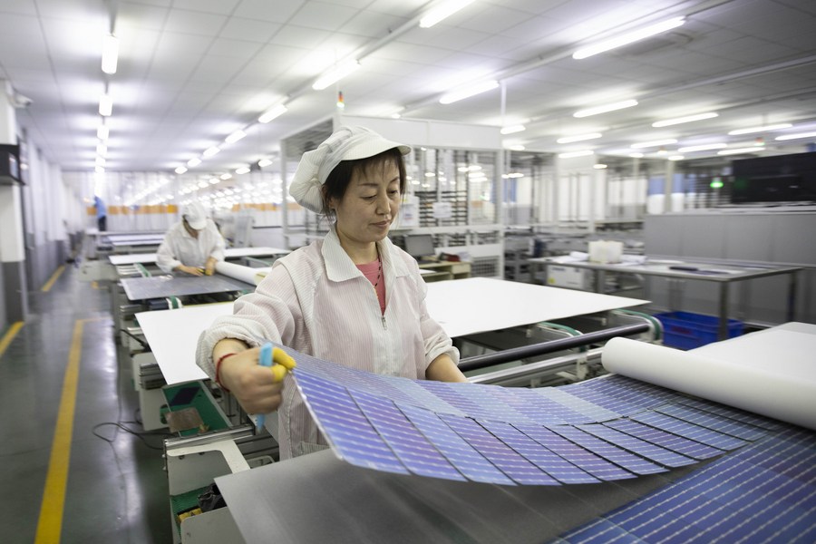 Employees work at a company producing solar modules in Dongying, east China's Shandong Province, Feb. 24, 2023. (Photo by Liu Yunjie/Xinhua)