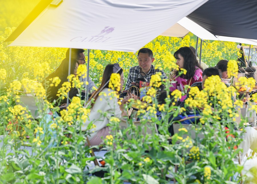 Tourists rest in a cole flower field in Daoming Town of Chongzhou, southwest China's Sichuan Province, March 5, 2023. (Xinhua/Wang Xi)