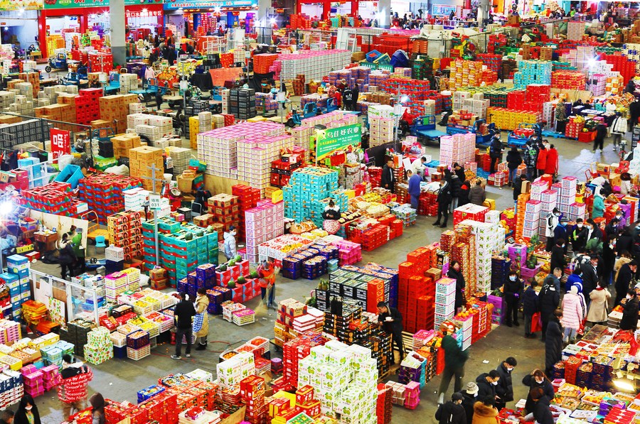 Consumers purchase goods for the Chinese New Year at a fruit market in Yiwu, east China's Zhejiang Province, Jan. 17, 2023. (Photo by Gong Xianming/Xinhua)