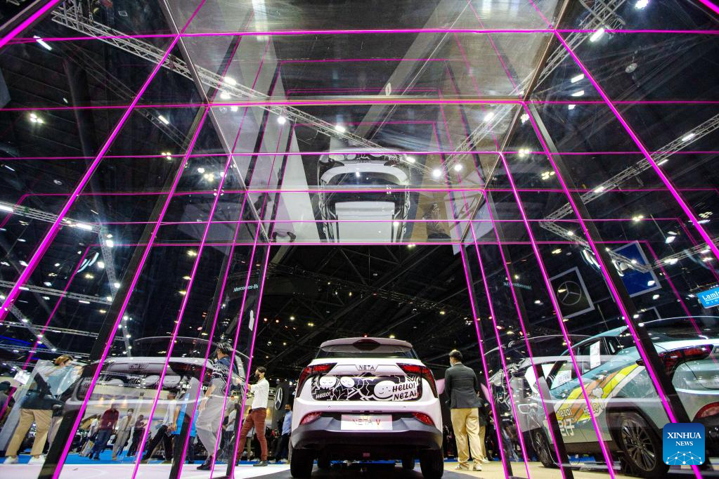 Visitors look at a NETA V produced by Chinese electric carmaker Hozon Auto during the 44th Bangkok International Motor Show in Bangkok, Thailand, March 22, 2023. The 44th Bangkok International Motor Show kicked off here on Wednesday and will last until April 2. (Xinhua/Wang Teng)