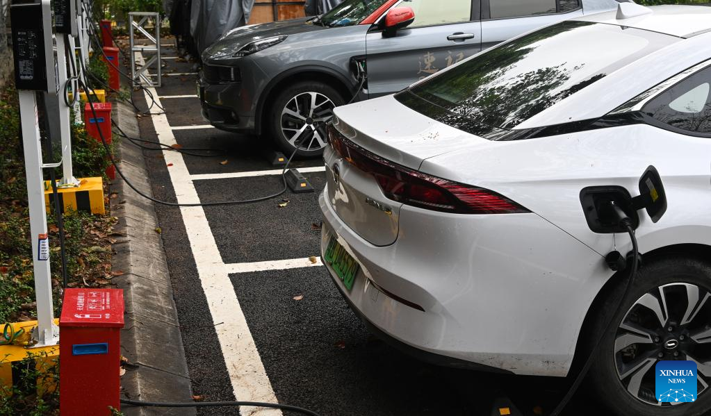 New energy vehicles are charged in the zero-carbon demonstration zone in Boao, south China's Hainan Province, March 28, 2023.