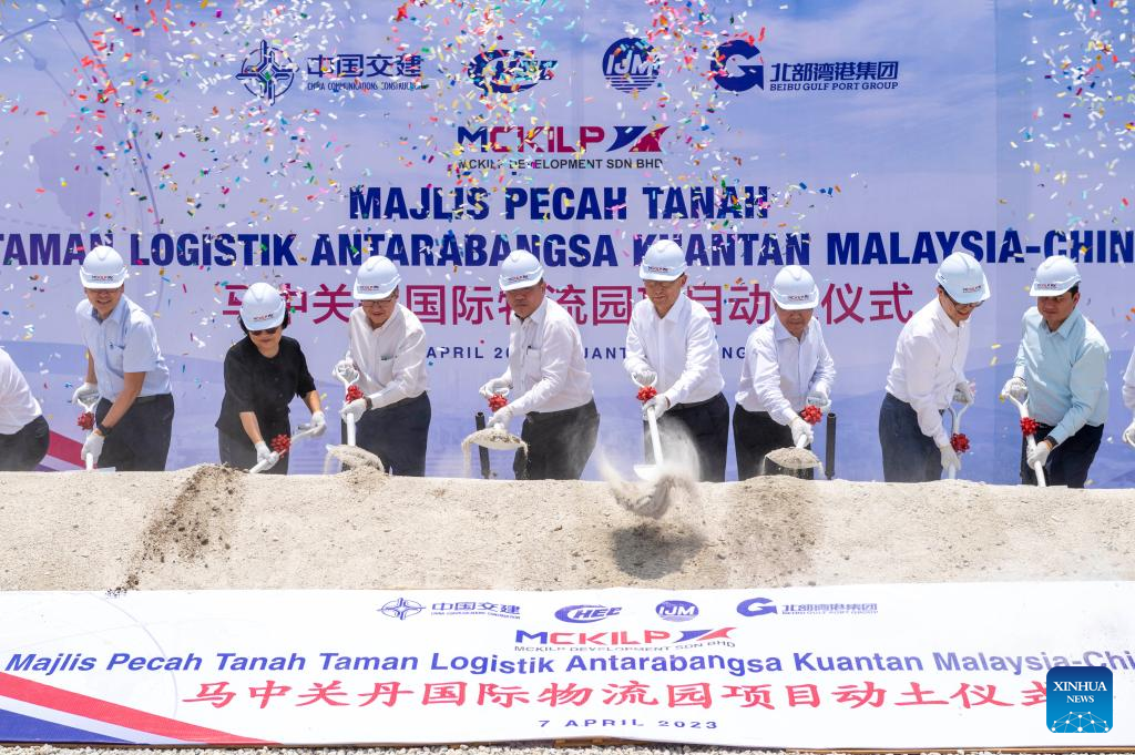 Guests attend the groundbreaking ceremony of the Malaysia-China Kuantan international logistic park in Kuantan, Pahang state of Malaysia, April 7, 2023. The Malaysia-China Kuantan Industrial Park (MCKIP), the first industrial park jointly developed by Malaysia and China, marked its 10th anniversary here on Friday.(Photo by Chong Voon Chung/Xinhua)