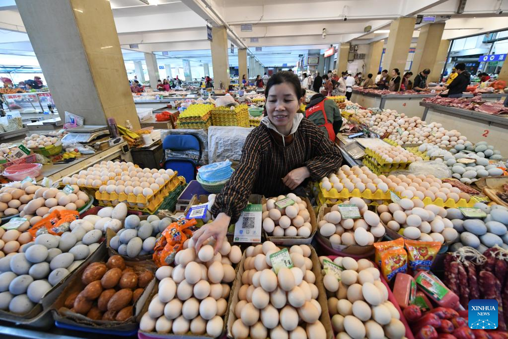 A vendor arranges eggs at a market in Nanning, south China's Guangxi Zhuang Autonomous Region, April 11, 2023. China's consumer prices registered a mild growth in March, in sharp contrast to the persistent global inflation, official data showed.