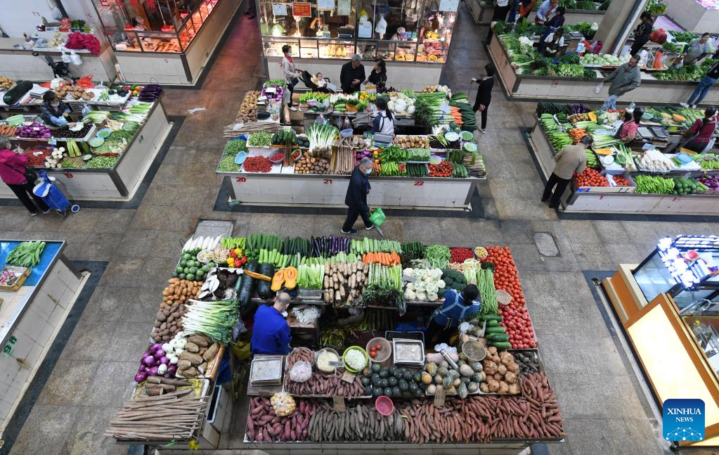 People shop for vegetables at a market in Nanning, south China's Guangxi Zhuang Autonomous Region, April 11, 2023. China's consumer prices registered a mild growth in March, in sharp contrast to the persistent global inflation, official data showed.