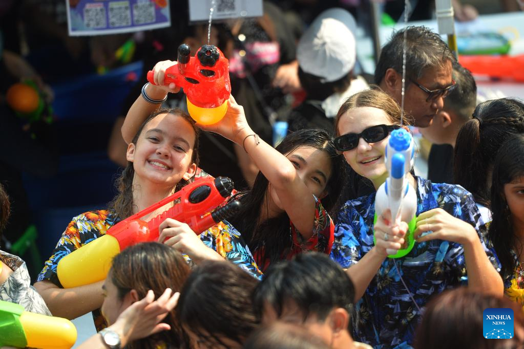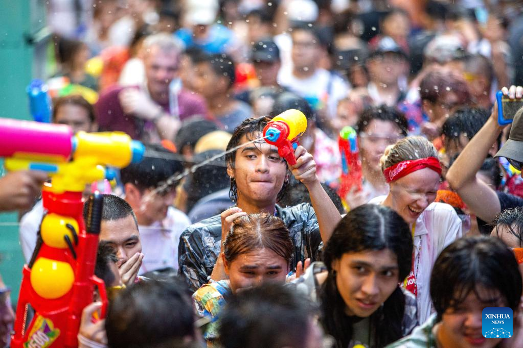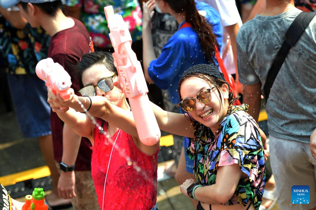 People attend water fight to celebrate the Songkran Festival in Bangkok, Thailand, April 13, 2023. Songkran Festival, the traditional Thai New Year, is celebrated from Thursday to Saturday, during which people express greetings by splashing water on each other. (Xinhua/Wang Teng)
