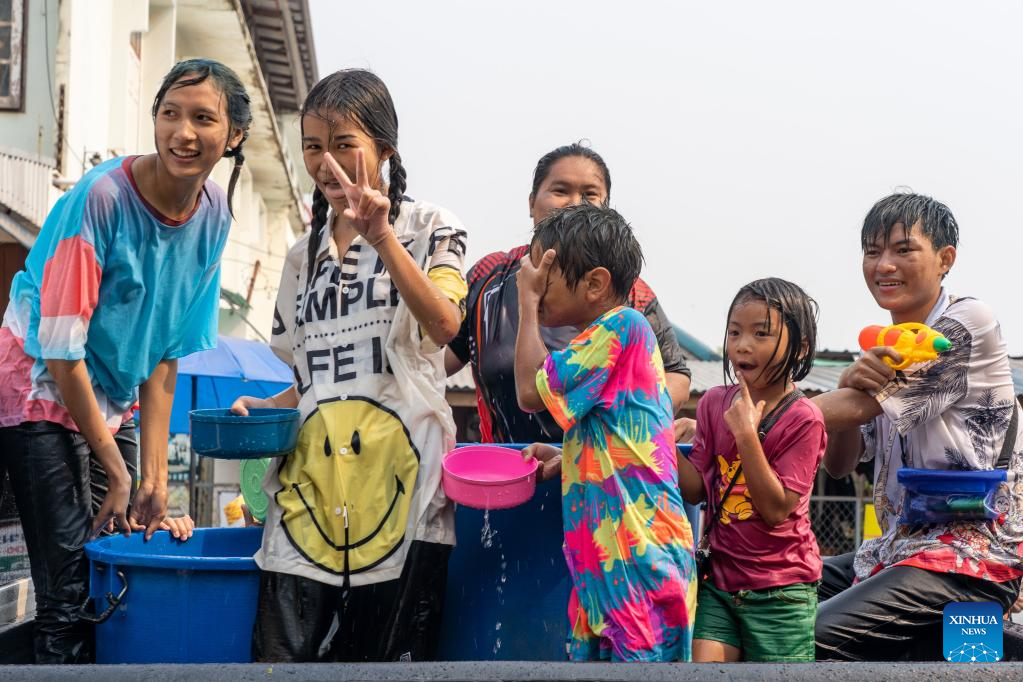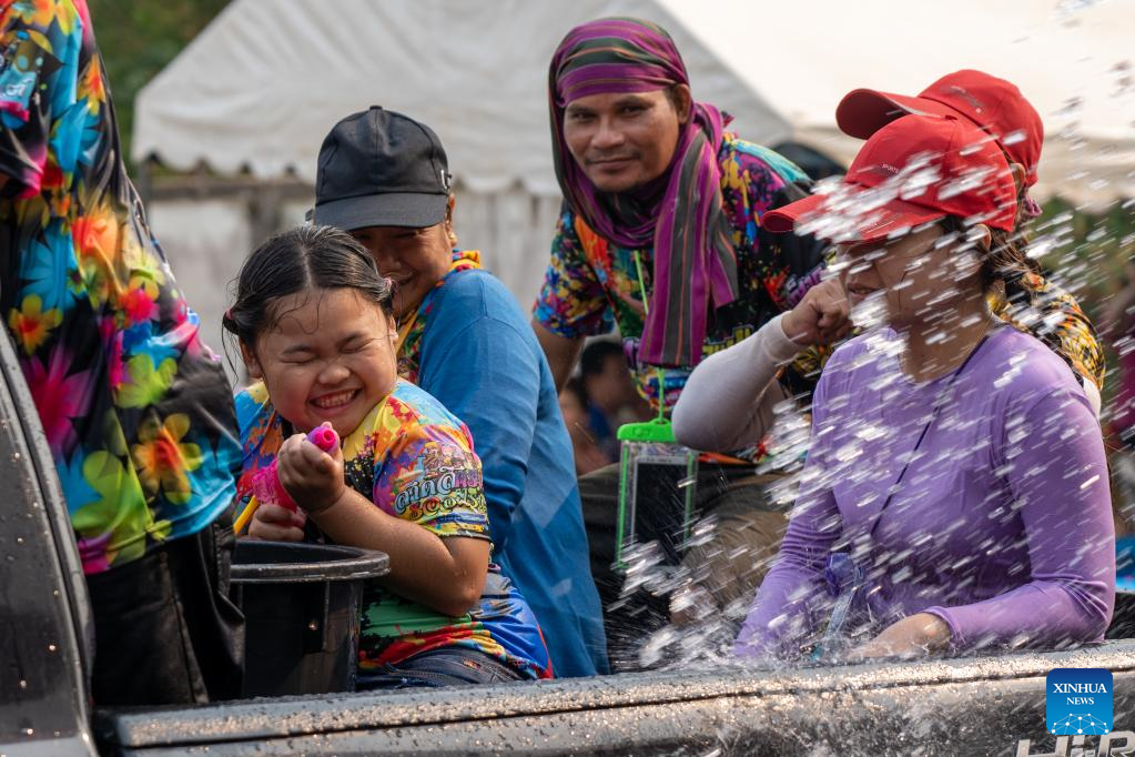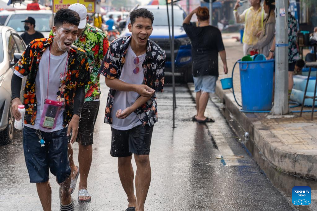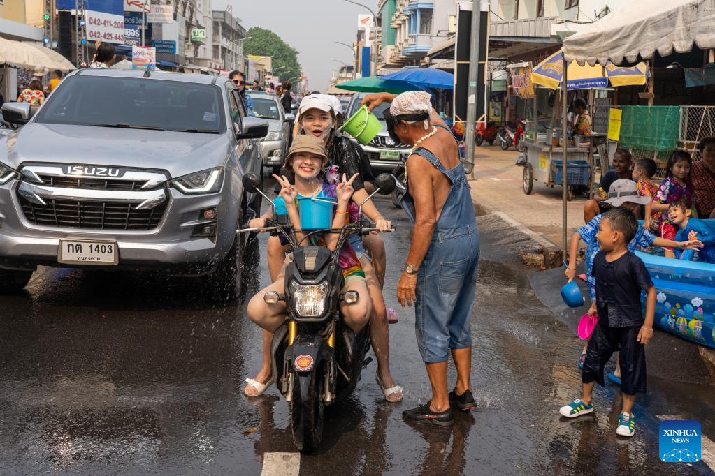 Locals celebrate the Songkran festival in Nong Khai province, Thailand, April 13, 2023. Songkran Festival, the traditional Thai New Year, is celebrated from Thursday to Saturday, during which people express greetings by splashing water on each other. (Xinhua/Lin Hao)