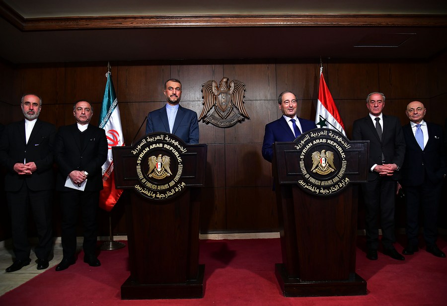 Syrian Foreign Minister Faisal Mekdad (3rd R) and his visiting Iranian counterpart Hossein Amir-Abdollahian (3rd L) attend a joint press conference in Damascus, Syria, Jan. 14, 2023.(Photo by Ammar Safarjalani/Xinhua)