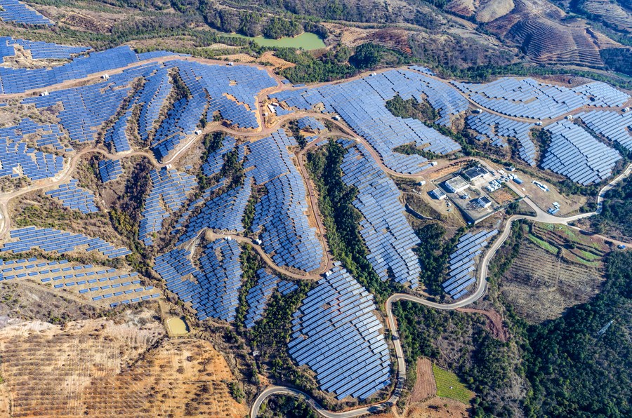 Aerial photo taken on Feb. 16, 2022 shows a photovoltaic power station in Yongren County of Chuxiong Yi Autonomous Prefecture, southwest China's Yunnan Province. (Xinhua/Chen Xinbo)