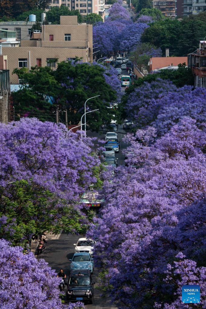 This photo taken on April 22, 2023 shows jacaranda trees in full bloom in Kunming, southwest China's Yunnan Province. (Xinhua/Hu Chao)