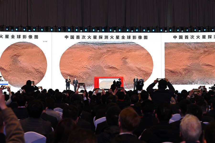 The China National Space Administration and the Chinese Academy of Sciences jointly release a series of global color images of Mars obtained from the country's first Mars exploration mission at the launch ceremony of the Space Day of China in Hefei, east China's Anhui Province, April 24, 2023. (Xinhua/Huang Bohan)