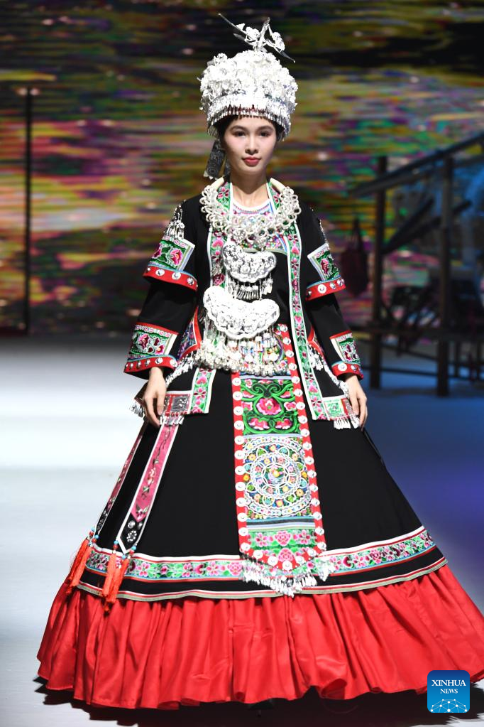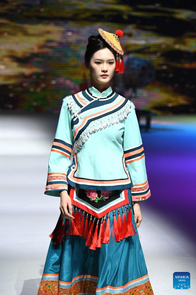 A model presents an ethnic costume during a costume show in Nanning, south China's Guangxi Zhuang Autonomous Region, April 24, 2023. (Xinhua/Zhou Hua)