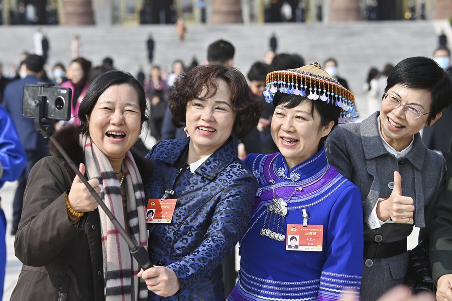 Members of the 13th National Committee of the Chinese People's Political Consultative Conference (CPPCC), pose for selfies after attending the second plenary meeting of the fourth session of the 13th CPPCC National Committee at the Great Hall of the People in Beijing, capital of China, March 7, 2021. (Xinhua/Li Xin)
