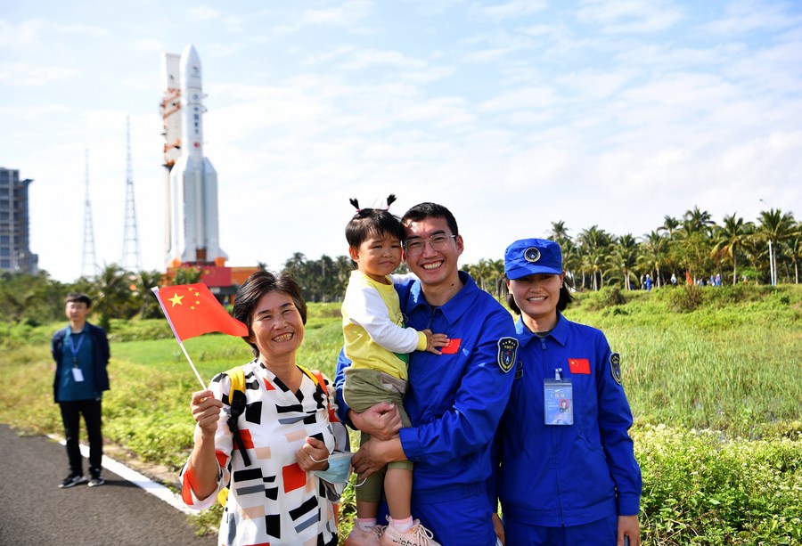 Staff members pose for a photo with their family at the Wenchang Spacecraft Launch Site in south China's Hainan Province, Nov. 17, 2020. (Xinhua/Guo Cheng)