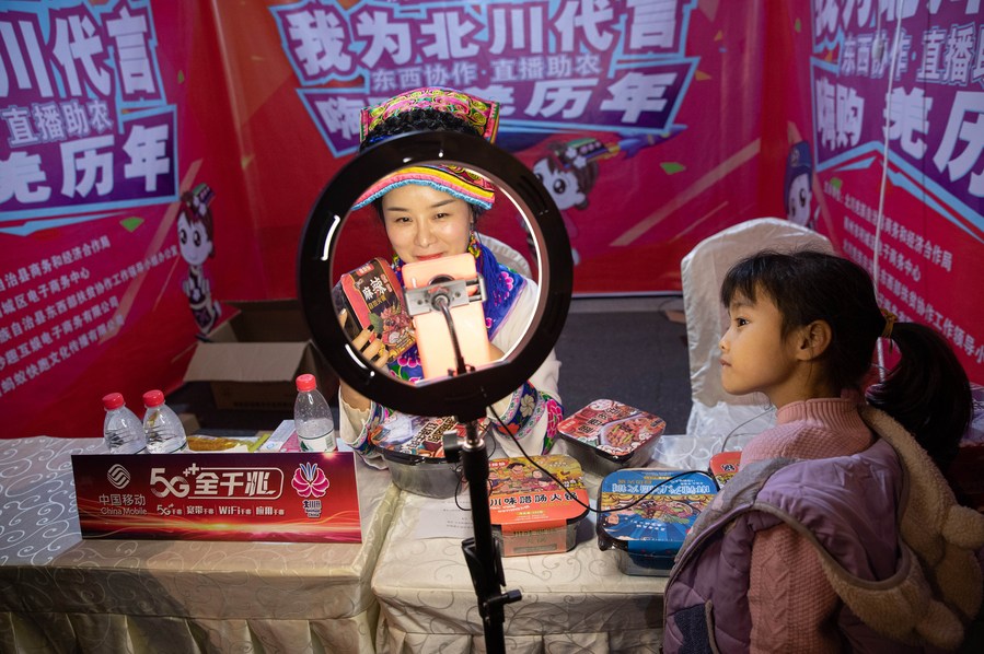 A child watches a livestreamer selling local products in Beichuan County, southwest China's Sichuan Province, Nov. 14, 2020.(Xinhua/Jiang Hongjing)