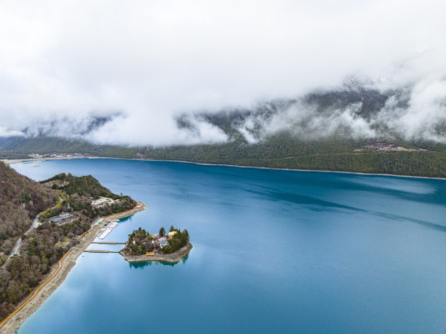This aerial photo taken on April 17, 2023 shows a view of the Basum Lake in Gongbo'gyamda County of Nyingchi, southwest China's Tibet Autonomous Region. (Xinhua/Sun Fei)