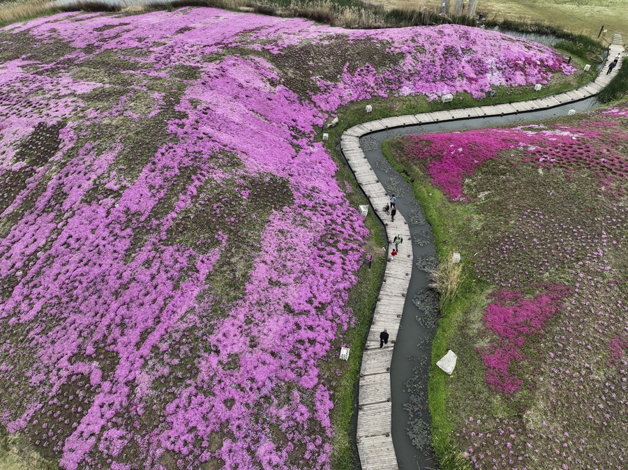 This aerial photo taken on April 5, 2023 shows tourists visiting flowers in a peony garden in Jiyuan City, central China's Henan Province. (Photo by Miao Qiunao/Xinhua)