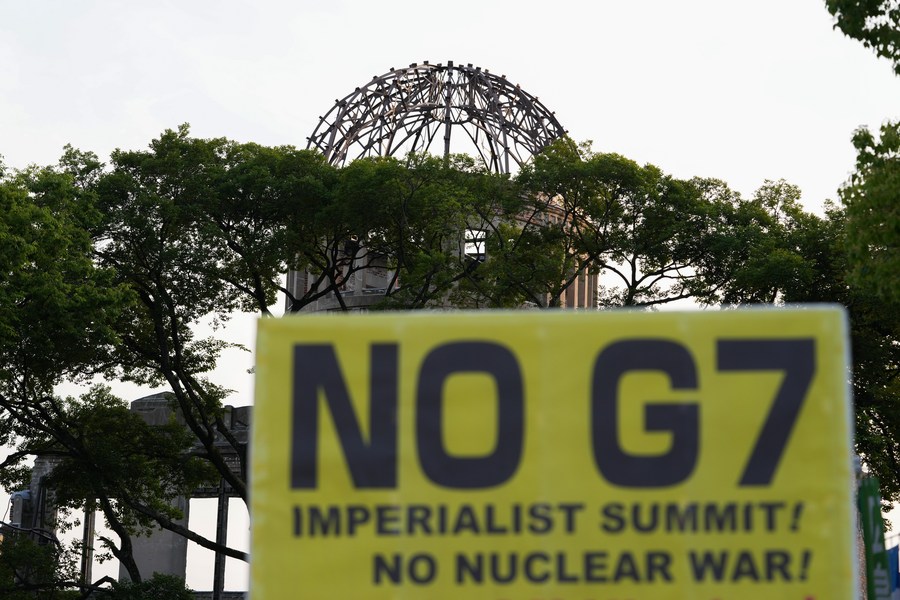 A slogan is pictured at the Hiroshima Peace Memorial Park in a protest against the upcoming Group of Seven (G7) summit, in Hiroshima, Japan, May 17, 2023. (Xinhua/Zhang Xiaoyu)