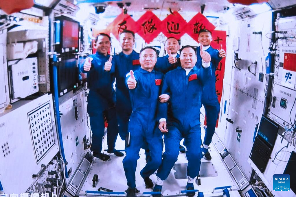 The three astronauts aboard China's Shenzhou-16 spaceship entered the country's space station and met with another astronaut trio on Tuesday, starting a new round of in-orbit crew handover.
