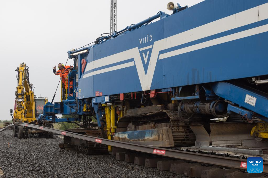 Against the backdrop of dark skies, pouring rain, thunder, and lightning, the arduous task of laying rails for the Chinese-built section in Hungary of the Budapest-Belgrade railway project got underway here on Tuesday, marking a significant milestone in the project.