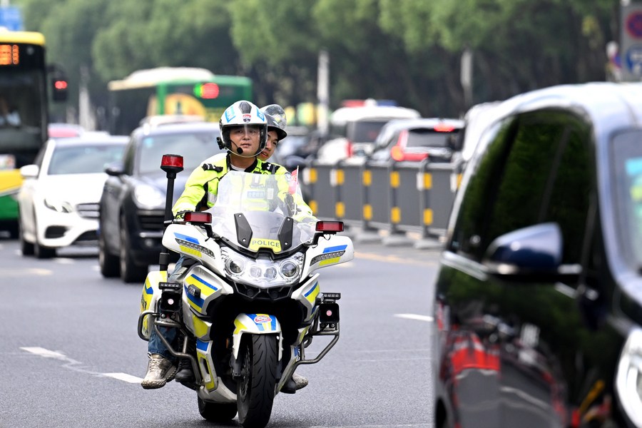 A traffic policeman drives an examinee to the exam site in Hefei, east China's Anhui Province, June 7, 2023. (Xinhua/Huang Bohan)