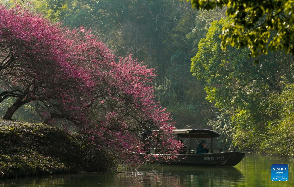 Tourists enjoy blossoms by boat in the Xixi Wetland in Hangzhou, east China's Zhejiang Province, Feb. 18, 2023.