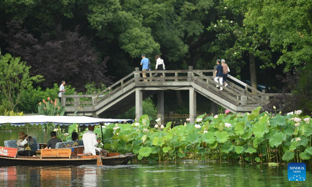 Tourists enjoy lotus flowers in the West Lake in Hangzhou, capital of east China's Zhejiang Province, June 11, 2023.