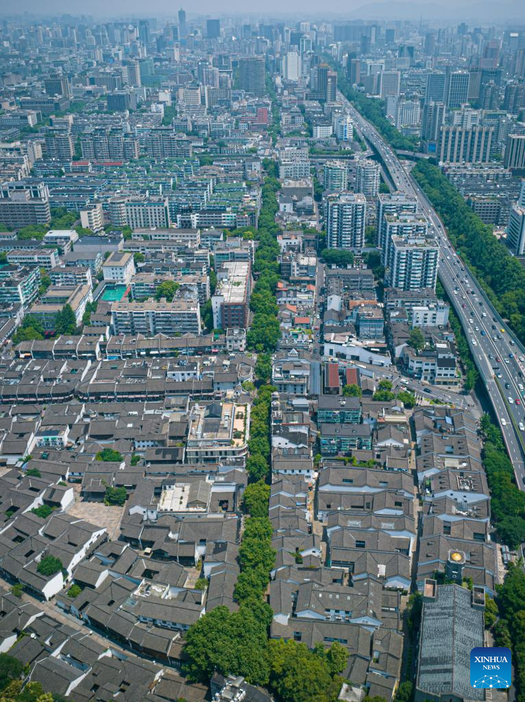 This aerial photo taken on June 10, 2023 shows the Southern Song Imperial Street in Hangzhou, east China's Zhejiang Province.