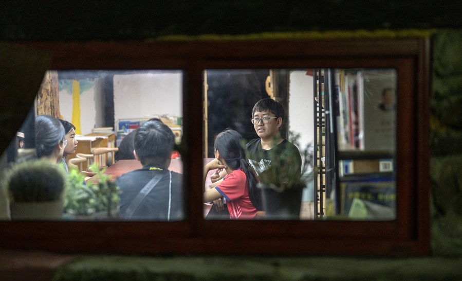 Gan Wenyong arranges books at the "Banshan Huayu" library in Qiunatong Village of Bingzhongluo Township in Gongshan Dulong and Nu Autonomous County, Lisu Autonomous Prefecture of Nujiang, southwest China's Yunnan Province, July 5, 2023. (Xinhua/Jiang Wenyao)
