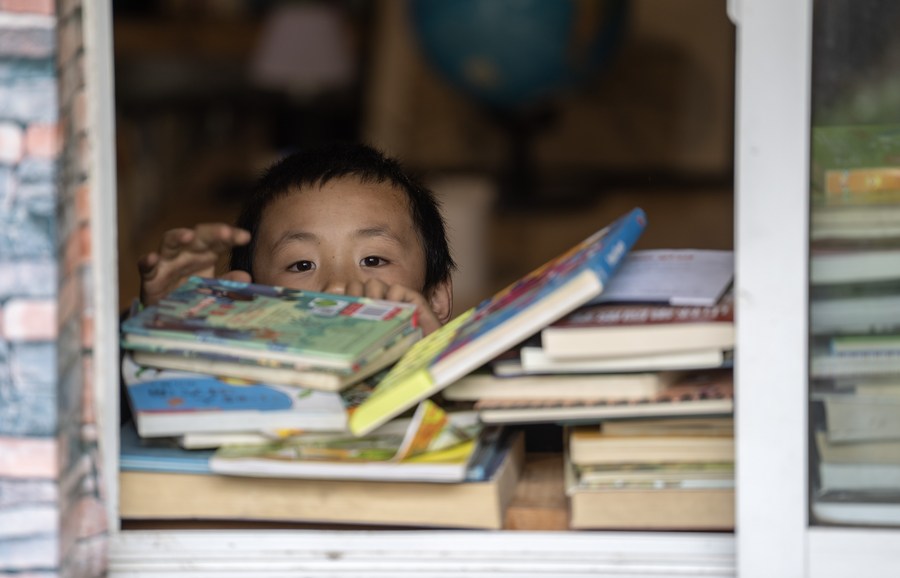 A child selects books at the "Banshan Huayu" library in Qiunatong Village of Bingzhongluo Township in Gongshan Dulong and Nu Autonomous County, Lisu Autonomous Prefecture of Nujiang, southwest China's Yunnan Province, July 5, 2023. (Xinhua/Jiang Wenyao)