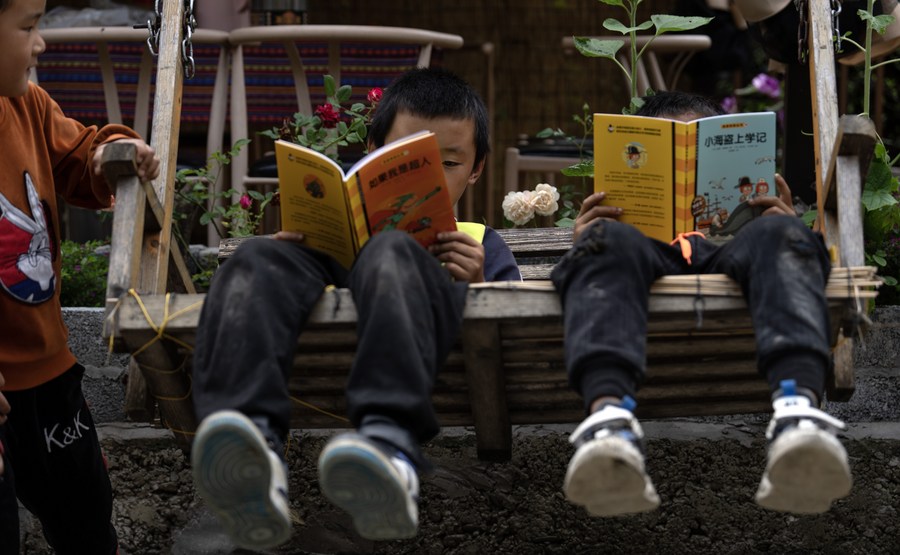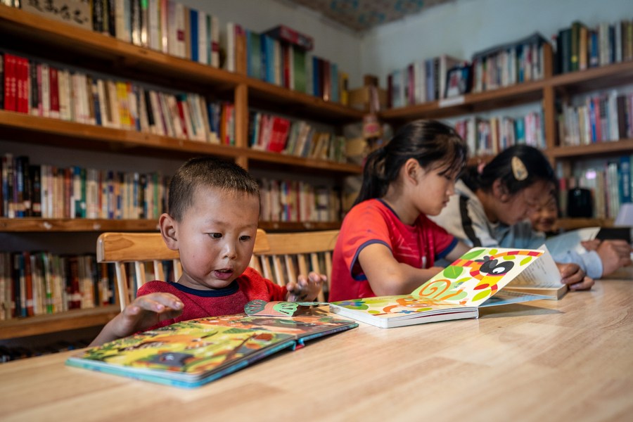 Children read books at the "Banshan Huayu" library in Qiunatong Village of Bingzhongluo Township in Gongshan Dulong and Nu Autonomous County, Lisu Autonomous Prefecture of Nujiang, southwest China's Yunnan Province, July 5, 2023. (Xinhua/Jiang Wenyao)