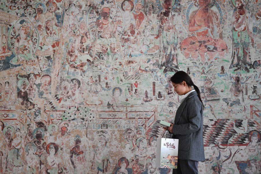 Liao Xueting, a marketer from the Dunhuang Academy's digital preservation team, walks past a high-fidelity replica of a mural in Dunhuang, northwest China's Gansu Province, April 25, 2023. (Xinhua/Chen Bin)