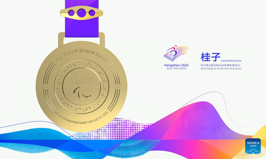 HANGZHOU, July 14 (Xinhua) -- With 100 days remaining before the Hangzhou Asian Para Games, the design of the medals and the materials to be used at award ceremonies were revealed on Friday at an event held at Fuyang Water Sports Center.