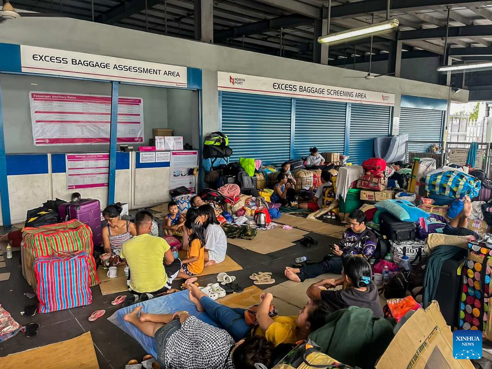 Passengers stranded due to Typhoon Doksuri take a rest at a port of Manila, the Philippines, on July 26, 2023. The Philippines' national disaster agency on Wednesday said it has so far tallied at least one dead as Typhoon Doksuri continued to batter the country with rain and strong winds. (Philippine Coast Guard/Handout via Xinhua)