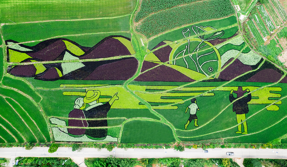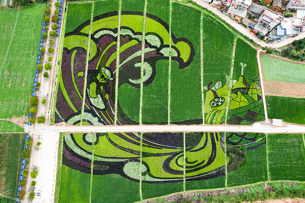 In Yiweili village, mountains in the rice pattern are like colorful carp. Lotus leaves represent local residents happy life and symbolizes the flower industry, which makes life more colorful.