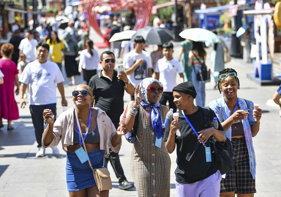 Members from South African dance troupe go sightseeing at the International Grand Bazaar in Urumqi, northwest China's Xinjiang Uygur Autonomous Region, July 25, 2023. (Xinhua/Hu Huhu)