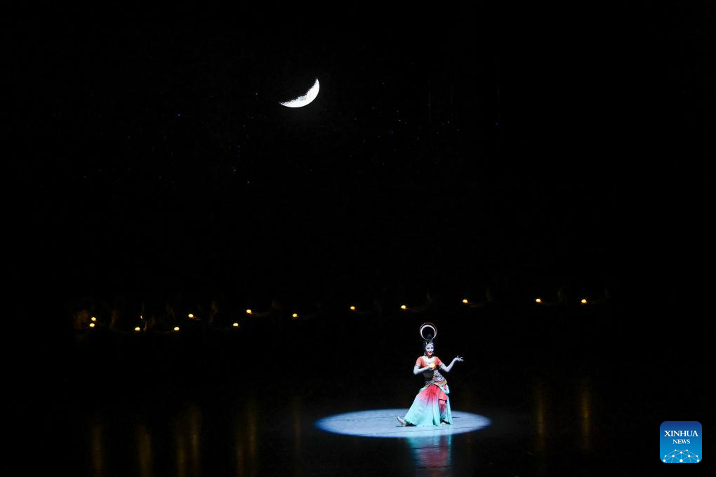 A dancer of a song and dance troupe from Hotan Prefecture performs a dance drama at a theater in Urumqi, northwest China's Xinjiang Uygur Autonomous Region, July 31, 2023. The dance drama was presented during the 6th China Xinjiang International Dance Festival. (Xinhua/Hao Zhao)