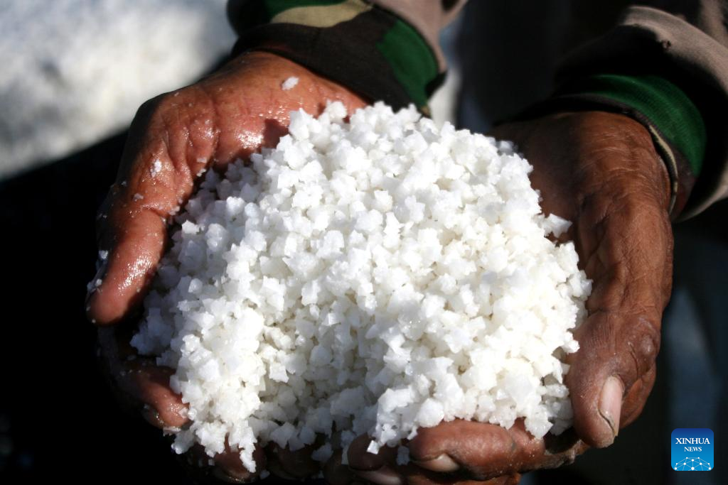 A farmer holds harvested salt in Tambak Cemandi village in Sidoarjo, East Java, Indonesia, July 31, 2023. (Photo by Sahlan Kurniawan/Xinhua)