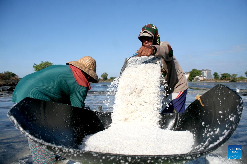 Farmers harvest salt in Tambak Cemandi village in Sidoarjo, East Java, Indonesia, July 31, 2023. (Photo by Sahlan Kurniawan/Xinhua)