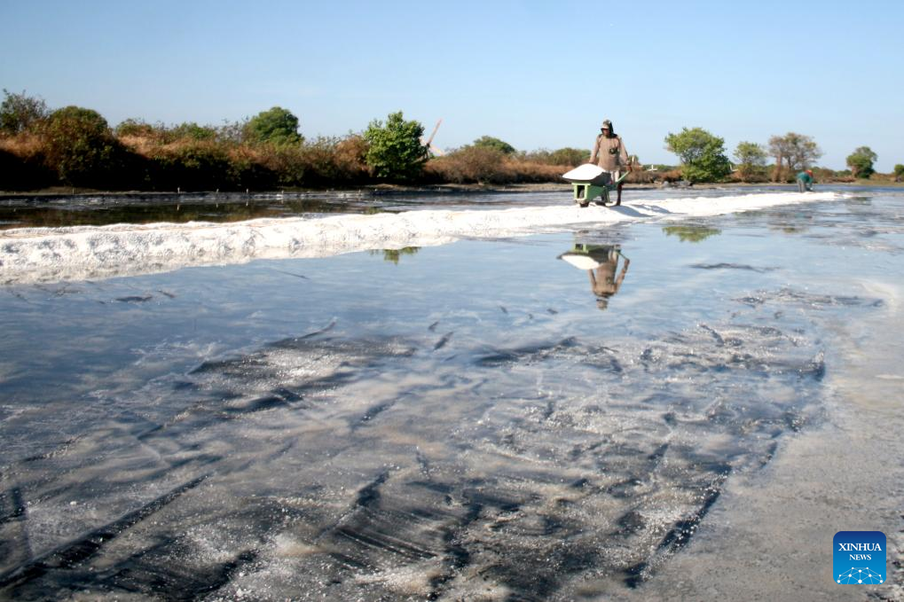 A farmer holds a cart carrying harvested salt in Tambak Cemandi village in Sidoarjo, East Java, Indonesia, July 31, 2023. (Photo by Sahlan Kurniawan/Xinhua)