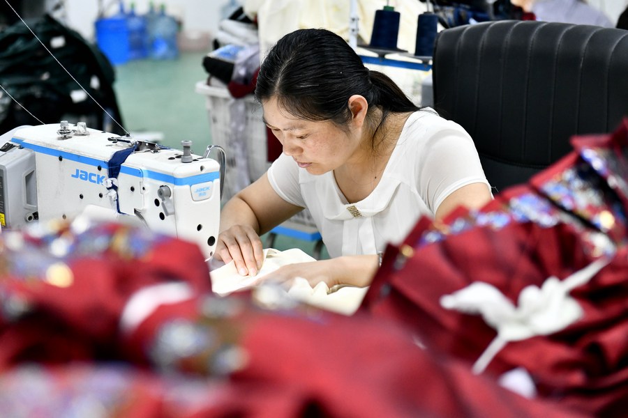 A staff member works at a Hanfu factory in Caoxian, east China's Shandong Province, July 6, 2023. (Xinhua/Guo Xulei)