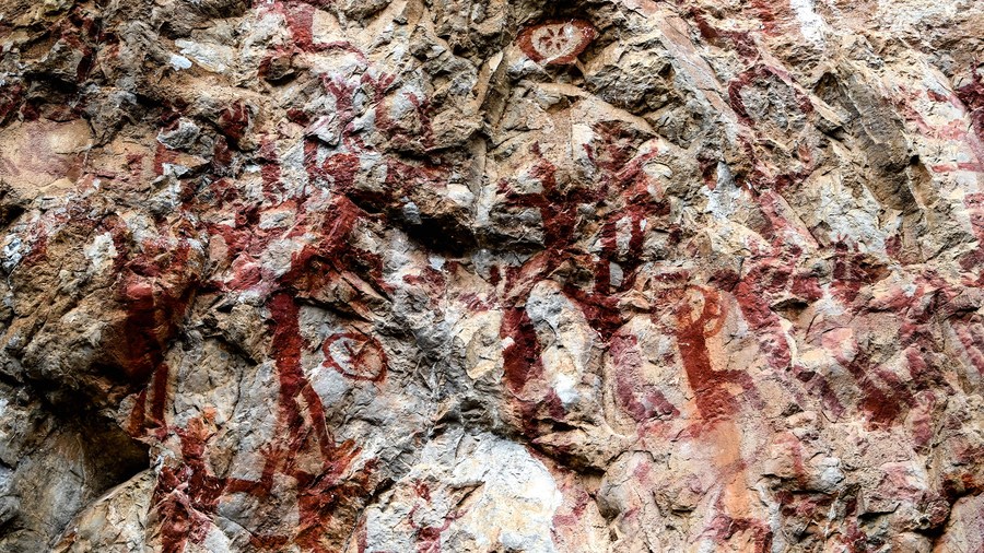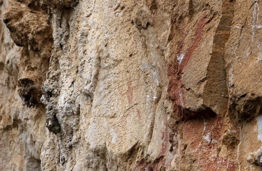 This photo taken on Aug. 8, 2023 shows a rock painting with a height of about 20 centimeters, the smallest one of Huashan rock paintings, in Ningming County, Chongzuo City, south China's Guangxi Zhuang Autonomous Region. (Xinhua/Fei Maohua)