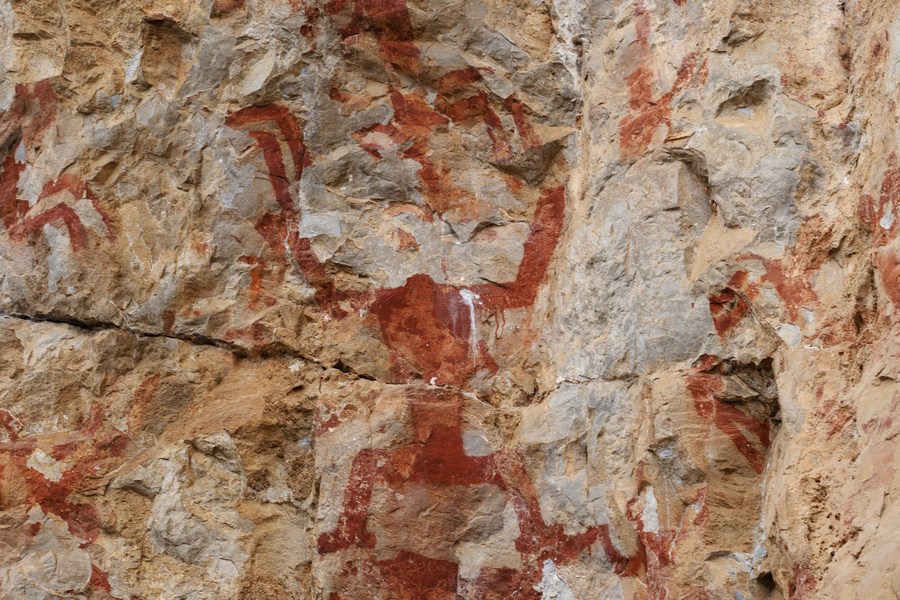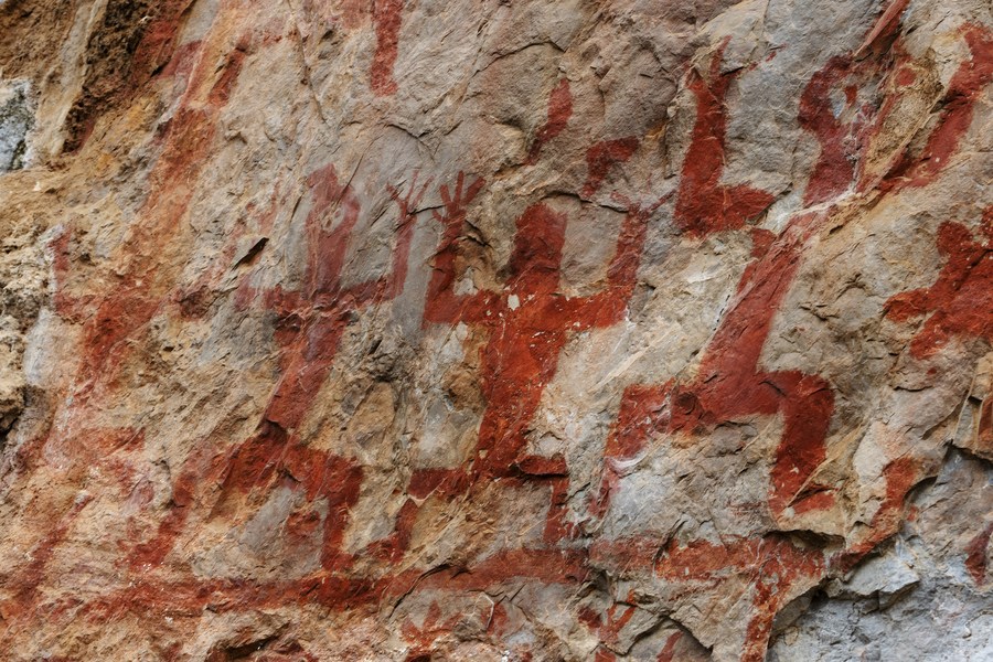 This photo taken on Aug. 8, 2023 shows a part of Huashan rock paintings in Ningming County, Chongzuo City, south China's Guangxi Zhuang Autonomous Region. (Xinhua/Zhou Hua)