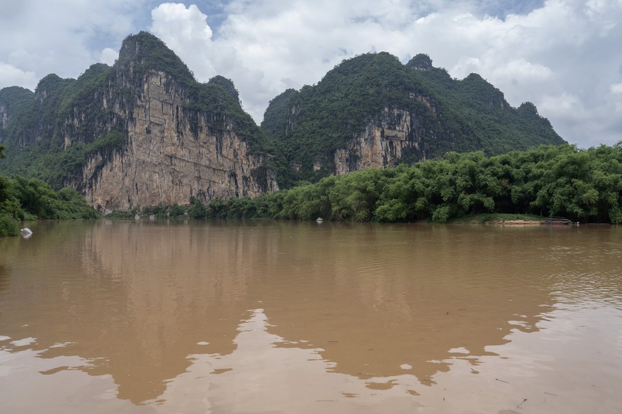 This photo taken on Aug. 8, 2023 shows Huashan mountains (L) in Chongzuo City, south China's Guangxi Zhuang Autonomous Region. (Xinhua/Fei Maohua)