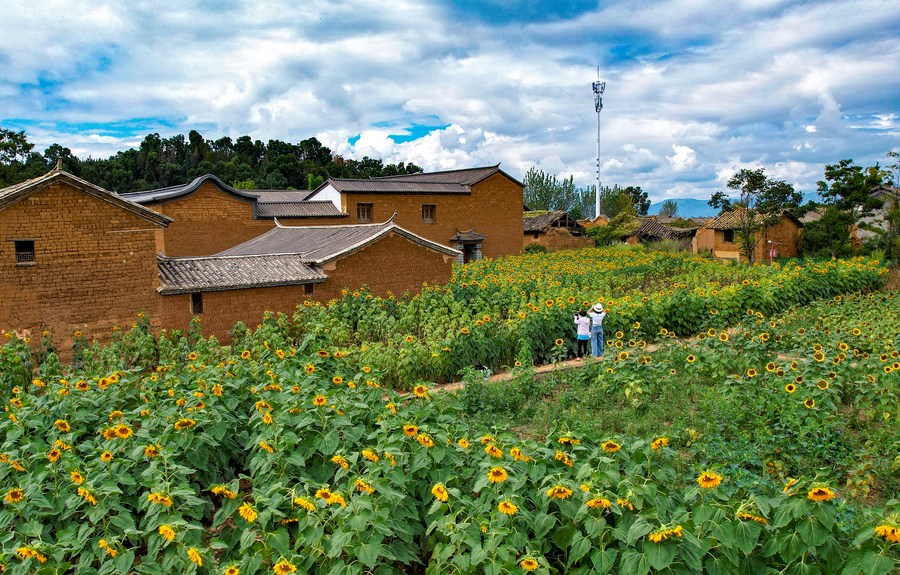This aerial photo taken on Oct. 3, 2023 shows tourists taking photos in a village near Dianchi Lake in Kunming, southwest China's Yunnan Province. (Xinhua/Chen Xinbo)