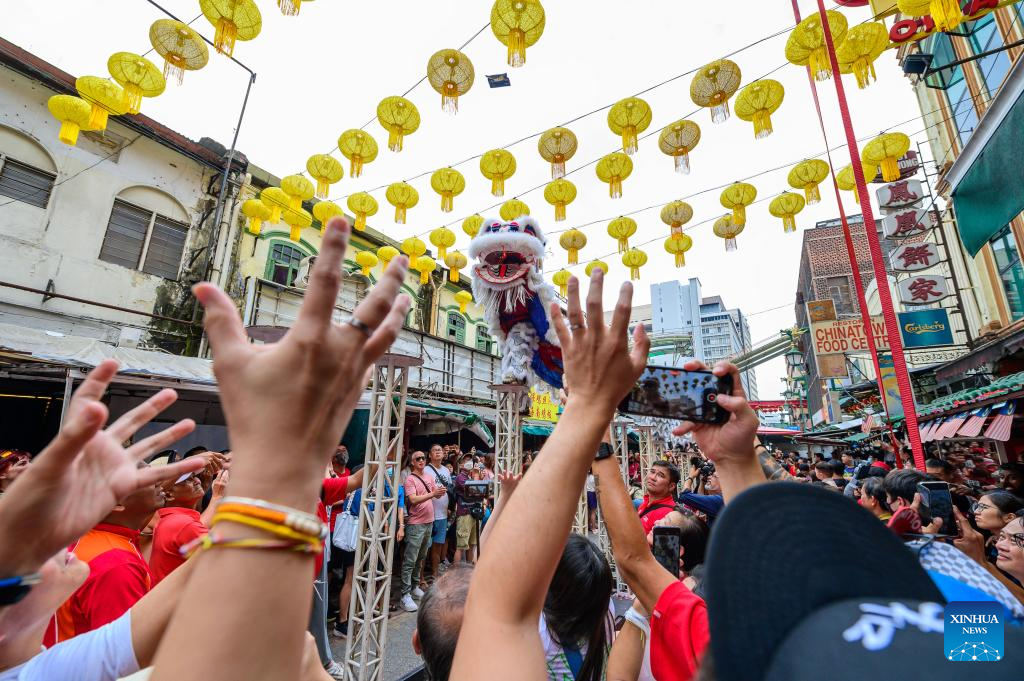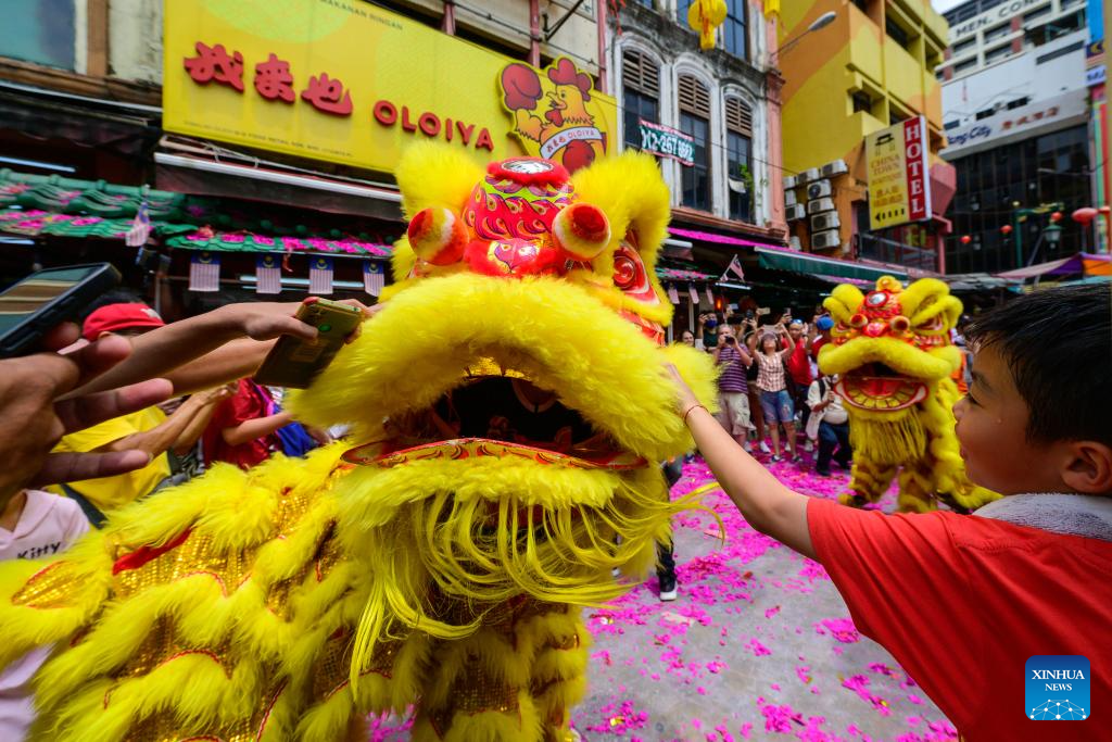 Members of a lion dance troupe perform during the Lantern Festival celebration at Petaling Street of Kuala Lumpur, Malaysia, Feb. 24, 2024. (Photo by Chong Voon Chung/Xinhua)