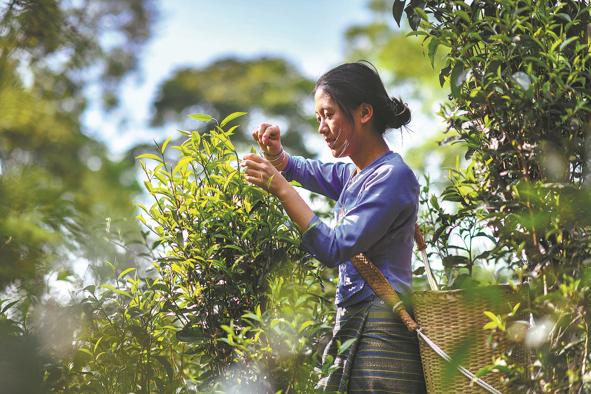 Tea farmer Huang Cuiping picks tea leaves at an ancient tea forest at Jingmai Mountain. JIANG WENYAO/XINHUA