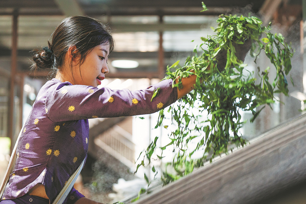 Ye Xiang, a member of the Dai ethnic group, processes raw tea leaves in a factory in Jingmai Mountain, Yunnan province, in September. HU CHAO/XINHUA